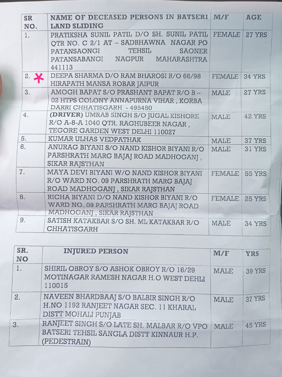 Dr. Deepa Sharma of Jaipur died in the landslide mishap in Batseri village, Sangla, HP on 2021-07-25